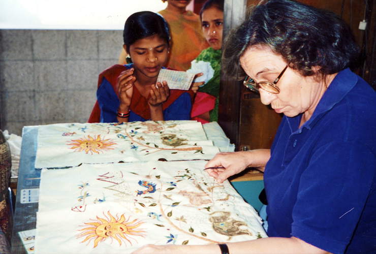 20代前半で単身インドに渡ったシスター・ルシアは、当初インドの尋常でない暑さや言葉などで大変苦労しましたが、今ではヒンドゥー語もマスターし、現地の女性としっかりと意思疎通をしています。スラムで、たった数人に刺繍を教え始めましたが、現在は300~400人の女性たちに仕事を創り出せるまでになっています。