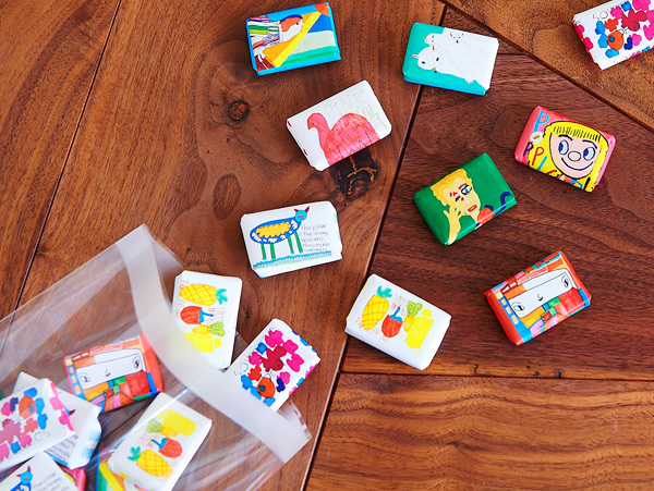 山本 頼子さん、池田 ジャスティーヌさん、水野 貴男さん、 栗田 佳子さん、岩本 義夫さん、清水 壮一郎 さん、6人のアーティストの作品が一口ミルクチョコレートのパッケージになりました。『限定アートBOX』は、チョコレートを食べ終わると、箱の底にもう1つデザインが登場する仕掛けがあり、箱はお部屋に飾ったり、アートとしてもお楽しみいただけます。『パーティーパック』は、一口サイズチョコレートがたっぷり45個入っており、ご自宅用にはもちろん、ポップでキュートなアートワークのパッケージはお配りギフトにもおすすめです!