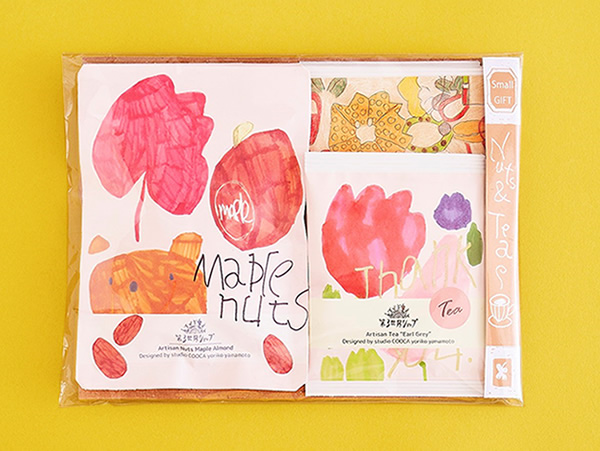 Artisanシリーズのお菓子は、ギフトセットだけの特別商品。添加物不使用の安心して食べられるお菓子です。紅茶は、インドから届くオーガニックの茶葉を使用したティーバッグタイプのフェアレード紅茶です。パッケージは、北野 里佳さん、水野 貴男さん、山本頼子さんのアートワーク。
